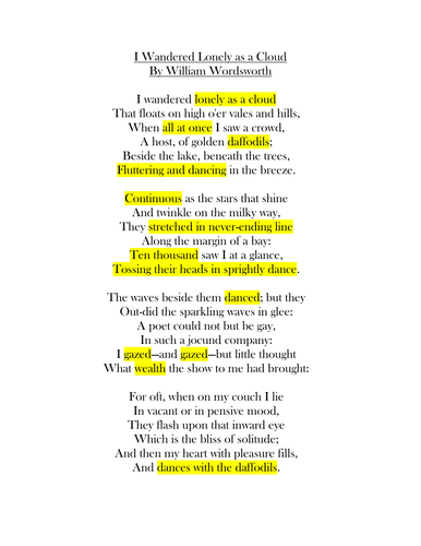 I wandered lonely as a cloud (also commonly known as daffodils) is a lyric poem by william wordsworth.